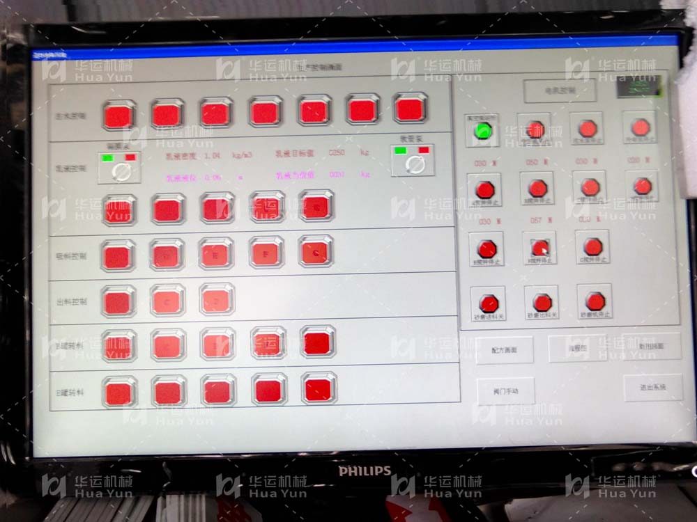 3.自動化控制系統(tǒng)由PLC,工業(yè)計(jì)算機(jī)及工業(yè)組態(tài)軟件等組成,操作臺帶模擬圖形,鼠標(biāo)點(diǎn)擊即可完成配方設(shè)置及助劑進(jìn)料等操作。
